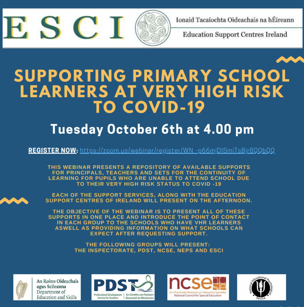 This webinar presents a repository of available supports for principals, teachers and SETs for the continuity of learning for pupils who are unable to attend school due to their very high risk status to Covid -19