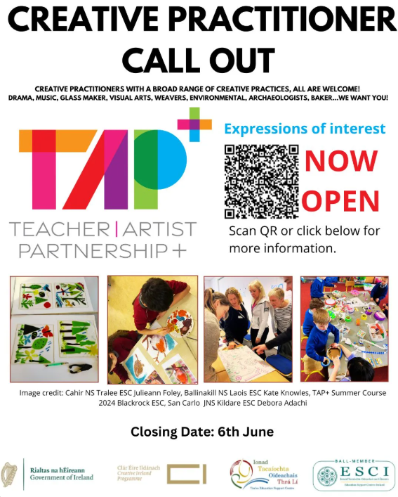 Develop creative partnerships with teachers and students. Receive funded training and residencies that bring creativity and the arts into schools across Ireland through TAP+, an initiative of Creative Youth 2023–27 under Creative Ireland and led by the Department of Education and Youth and Education Support Centres Ireland (ESCI).