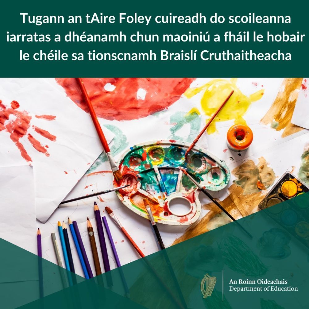Thug an tAire Oideachais Norma Foley TD cuireadh inniu do bhunscoileanna agus d’iar-bhunscoileanna ar fud na hÉireann iarratas a dhéanamh ar Bhraislí Cruthaitheacha, an tionscnamh atá ar siúl mar chuid d’Éire Chruthaitheach agus faoin gCiste Sármhaitheas Scoile. Is é €595,000 buiséad na Roinne Oideachais do Bhraislí Cruthaitheacha in 2022.
